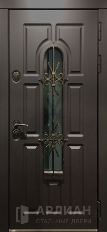 Входная коричневая дверь в частный дом со стеклопакетом и ковкой №11